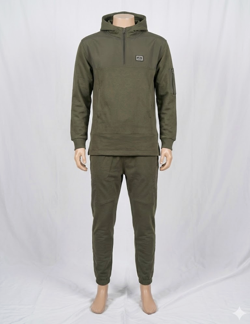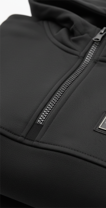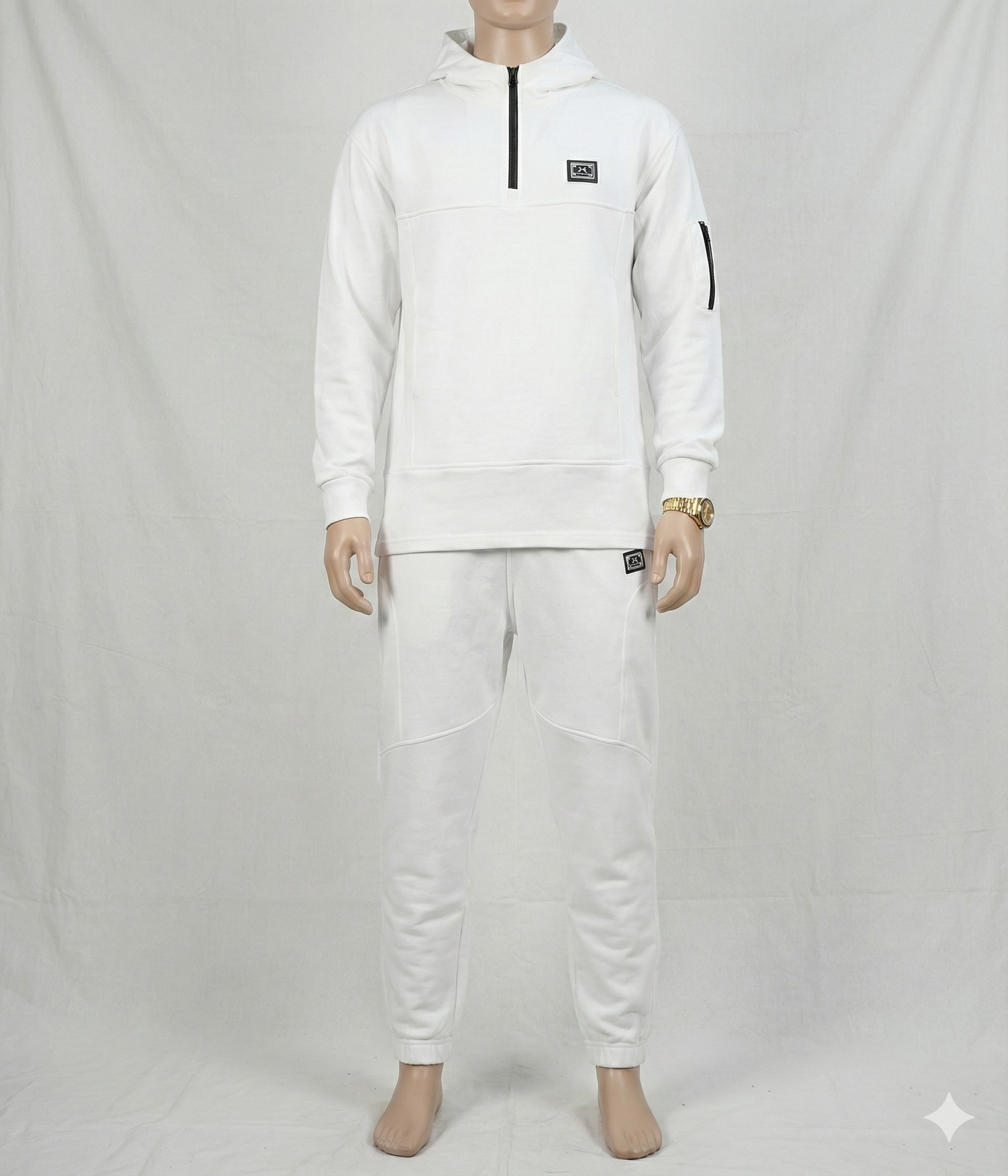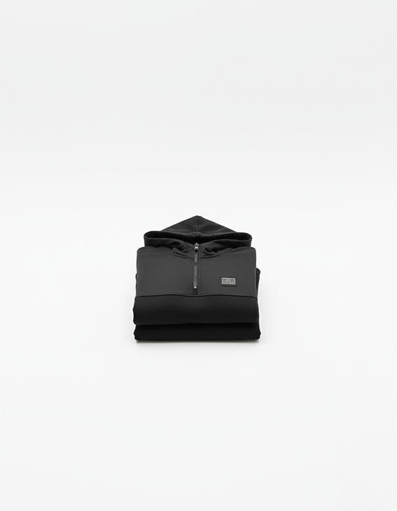 Le haut est doté d’une capuche, d’une fermeture zippée au niveau du col et d’une poche kangourou fonctionnelle, alliant style urbain et praticité. Les poignets sont resserrés par un élastique large offrant un maintien confortable, tandis qu’un zip discret sur l’avant-bras gauche apporte une touche originale et contemporaine.