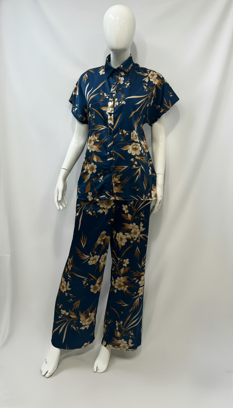 Ensemble deux pièces Satin Élya – Floralys, composé d’une chemise manches courtes à col classique avec fermeture boutonnée sur l’avant, assortie à un pantalon droit et ample. Confectionné dans un tissu léger et fluide, il offre un tombé élégant et confortable.
