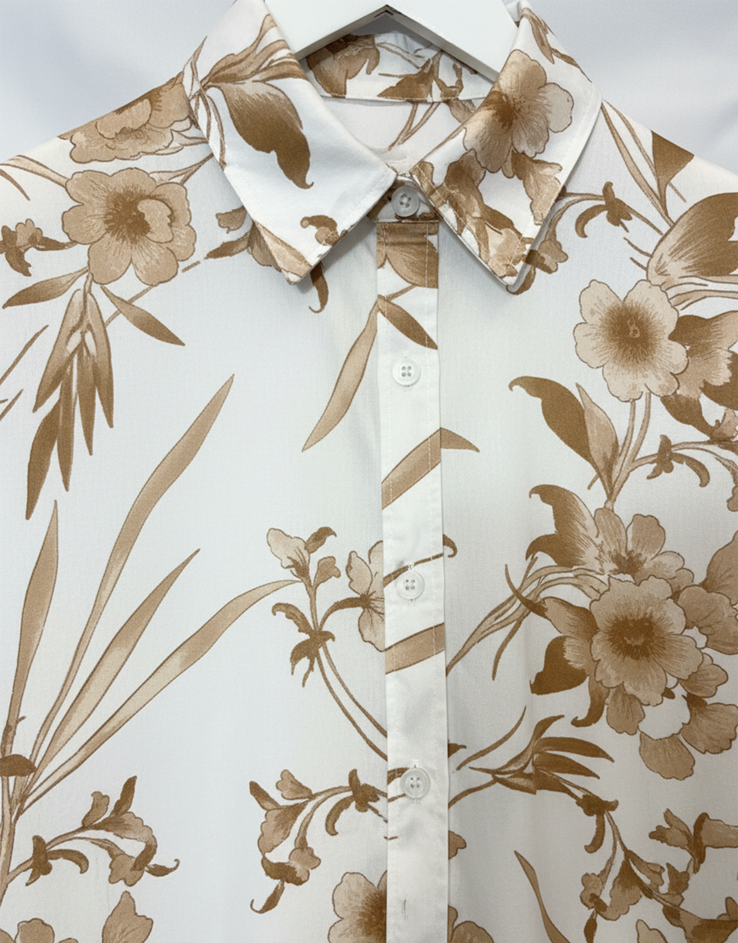 Son imprimé floral marron sur fond blanc apporte une touche raffinée et moderne.