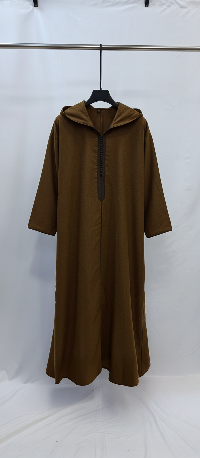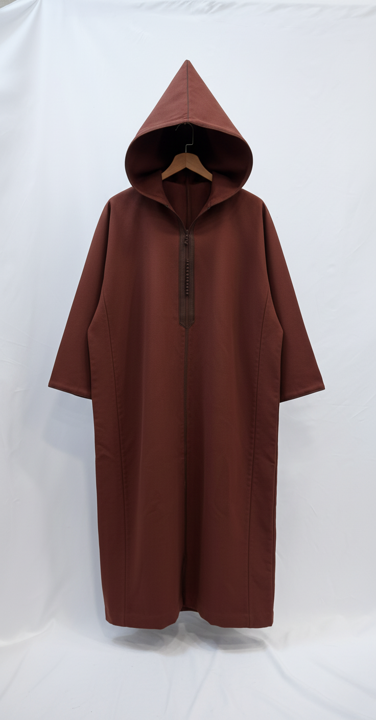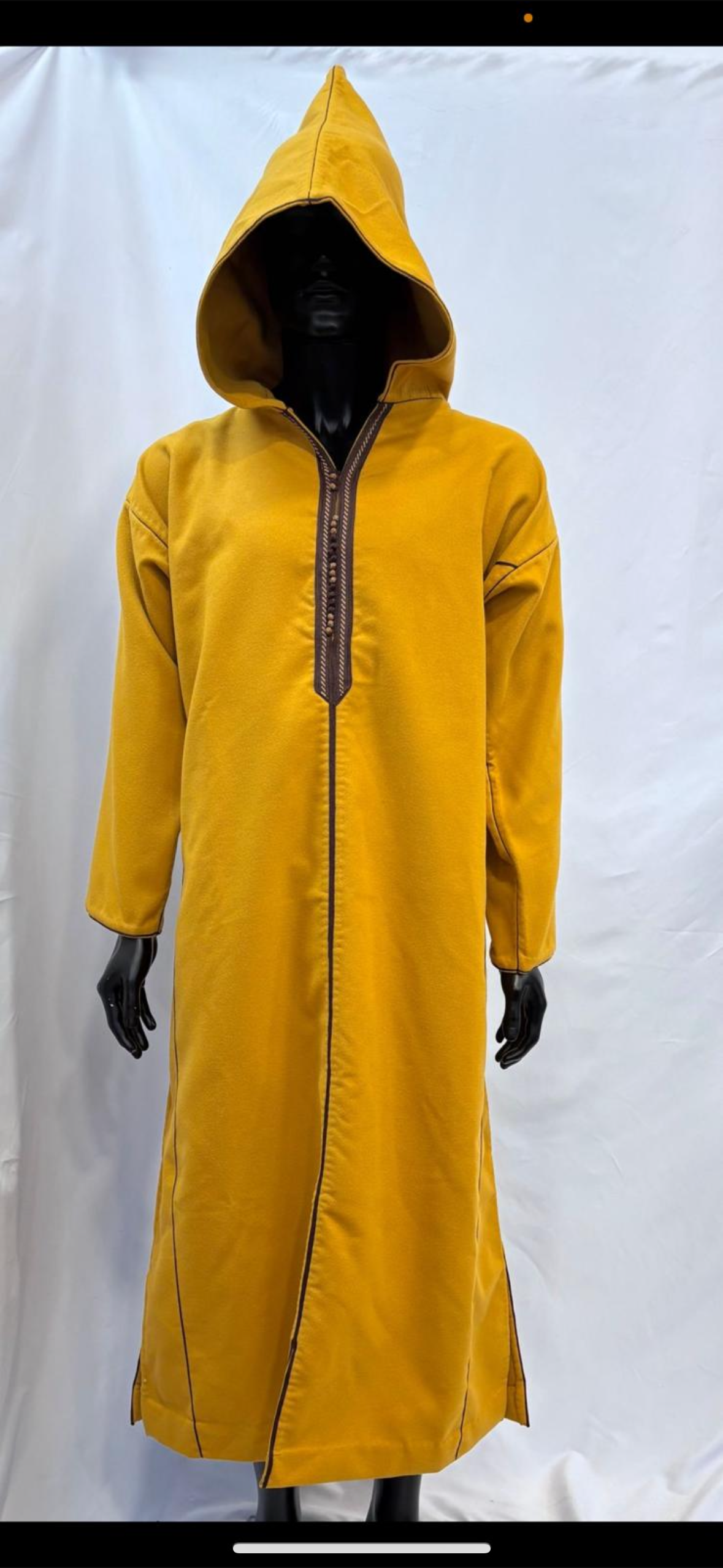 Elle est dotée d’une capuche pointue emblématique, signature de la jellaba classique, qui renforce son caractère culturel et intemporel. La matière épaisse et les finitions soignées garantissent une excellente durabilité, faisant de cette jellaba un vêtement aussi pratique que raffiné.