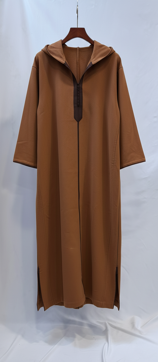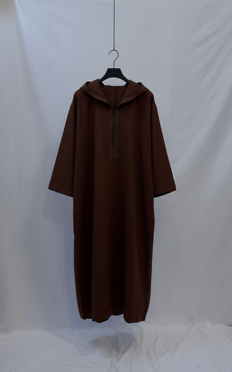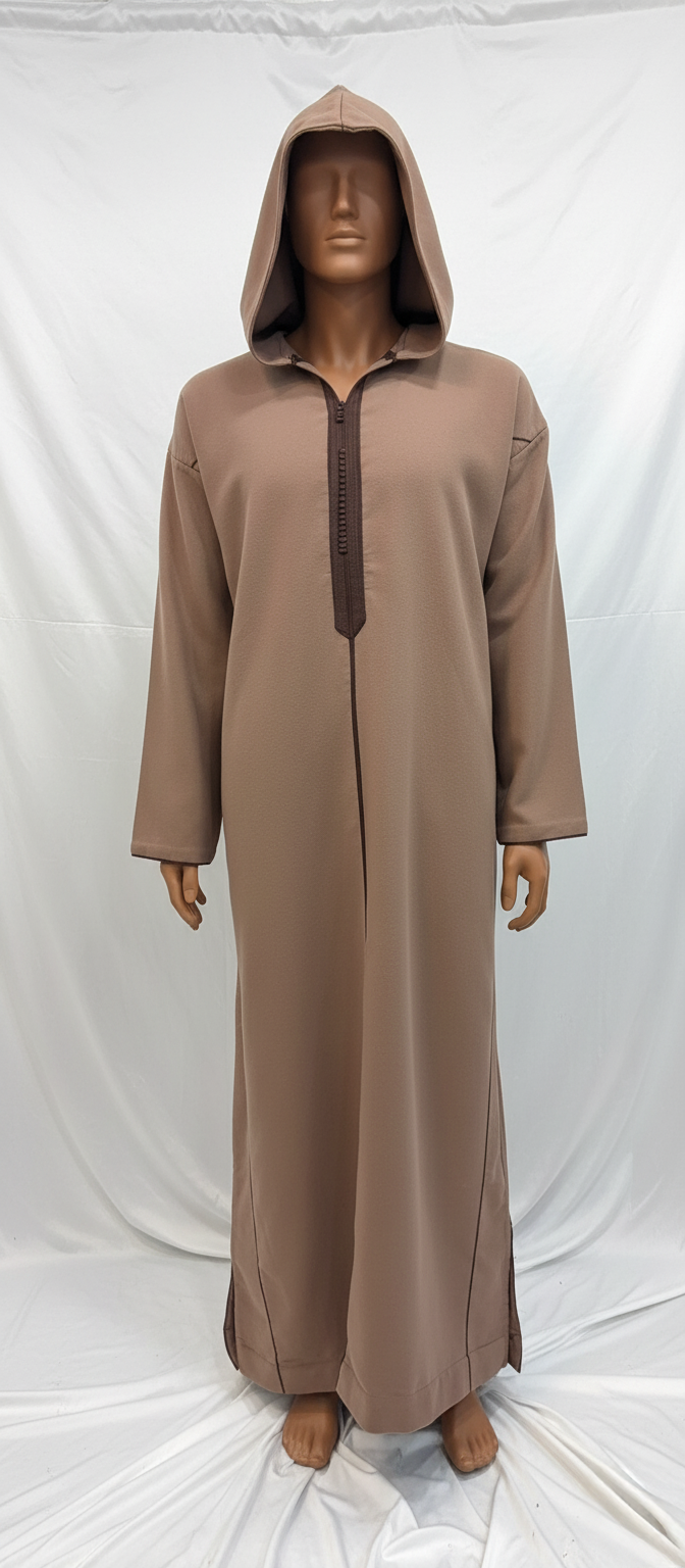 Elle est dotée d’une capuche pointue emblématique, signature de la jellaba classique, qui renforce son caractère culturel et intemporel. La matière épaisse et les finitions soignées garantissent une excellente durabilité, faisant de cette jellaba un vêtement aussi pratique que raffiné.