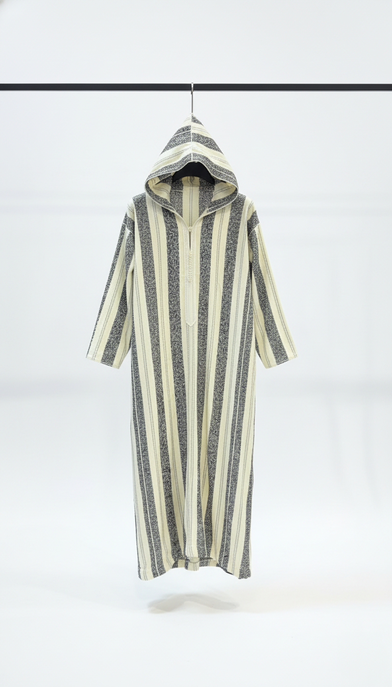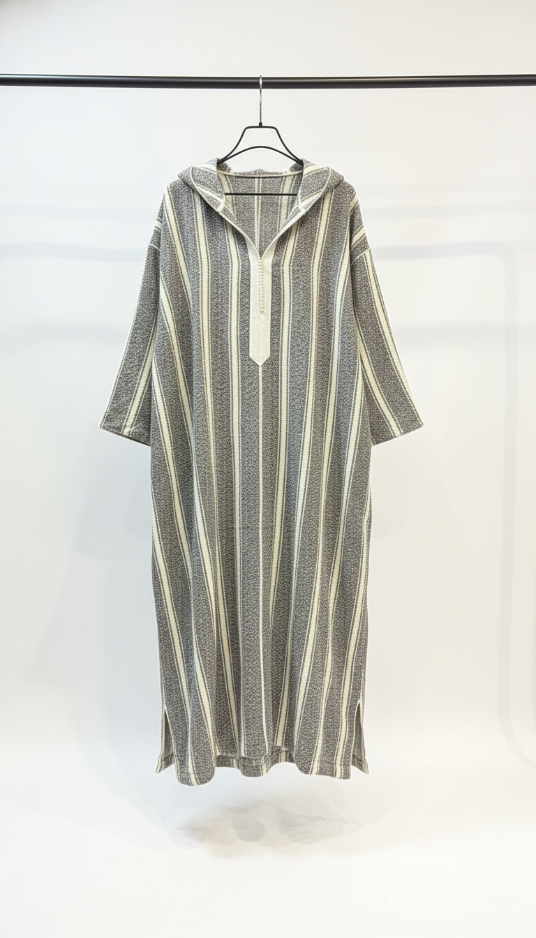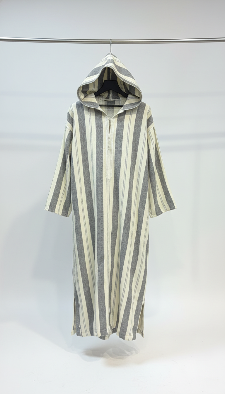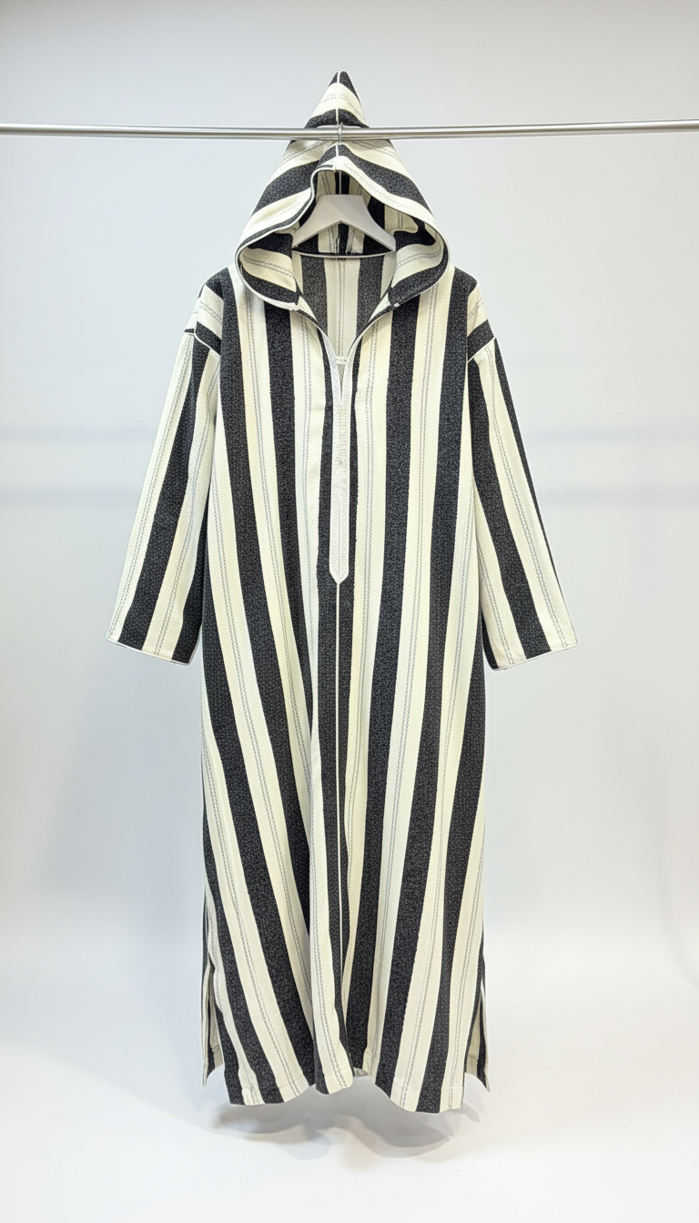 La jellaba FES est une jellaba traditionnelle marocaine pour homme, reconnaissable à ses rayures verticales authentiques et à sa capuche pointue emblématique. Sa coupe longue et fluide assure une grande liberté de mouvement tout en conservant une allure élégante et intemporelle.