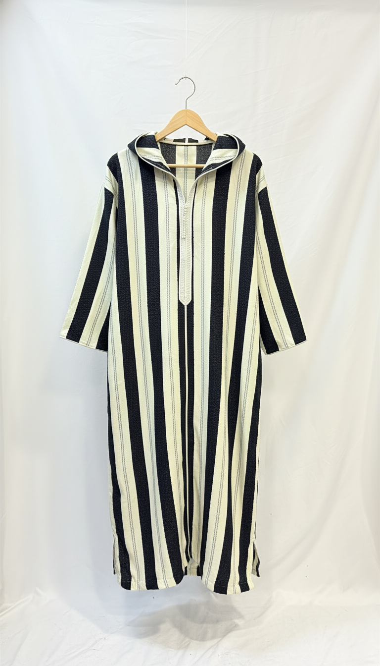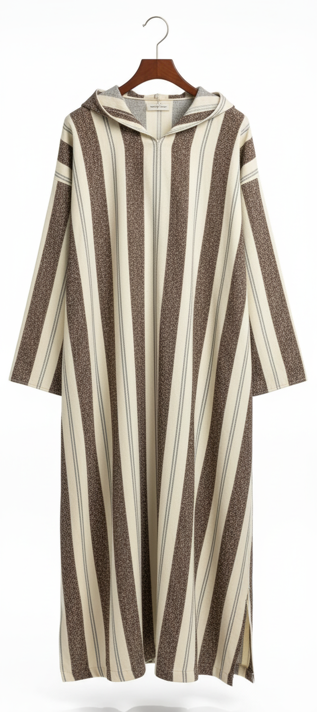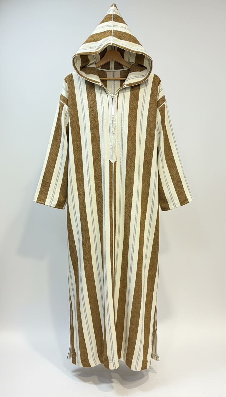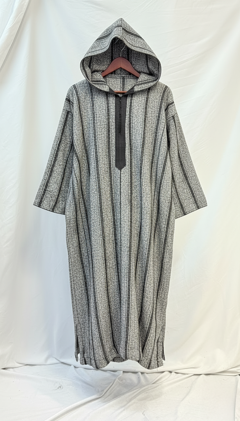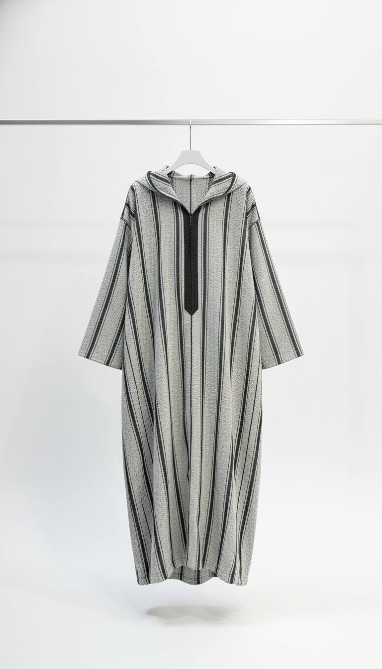 La jellaba FES est une jellaba traditionnelle marocaine pour homme, reconnaissable à ses rayures verticales authentiques et à sa capuche pointue emblématique. Sa coupe longue et fluide assure une grande liberté de mouvement tout en conservant une allure élégante et intemporelle.