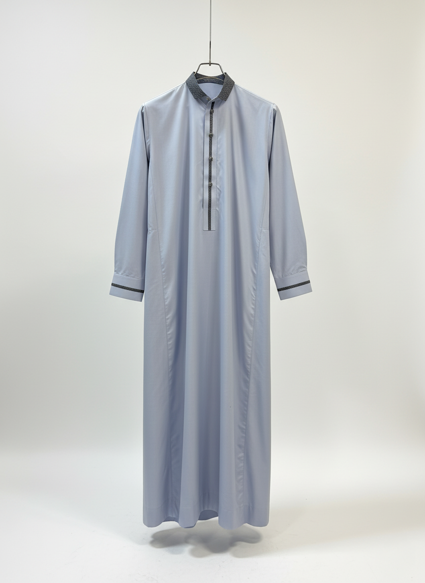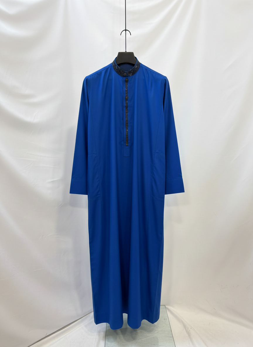 Sa coupe droite assure une silhouette élégante, fidèle à l’esprit du qamis traditionnel, tout en intégrant des détails modernes pour un style distingué.
