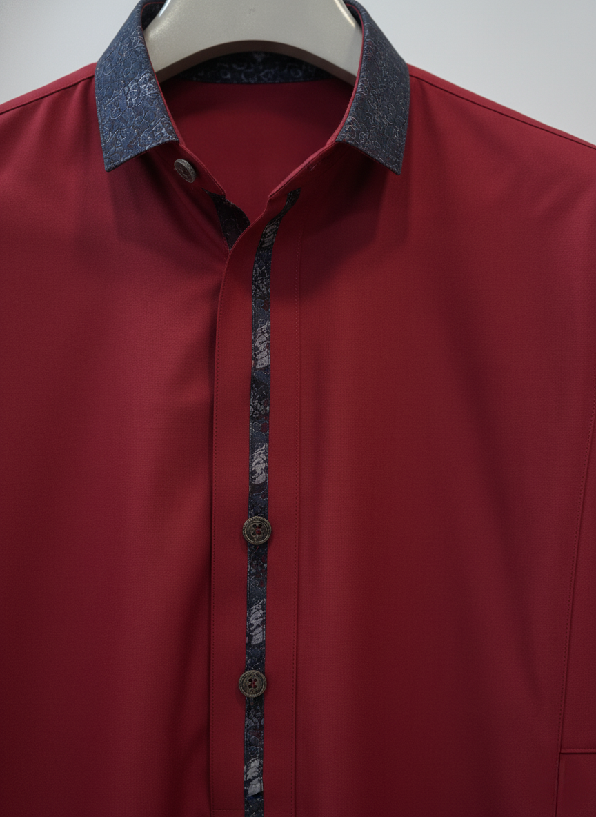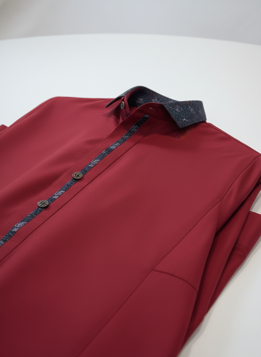Son col officier est délicatement orné d’un liseret à motifs, rappelé sur le bout des manches pour une harmonie visuelle raffinée. La patte de boutonnage décorée de boutons dorés apporte une touche noble et contemporaine, tandis que la poche pectorale assortie renforce l’équilibre du design.