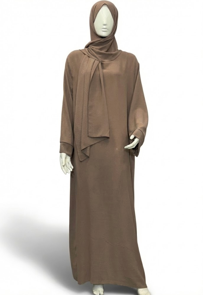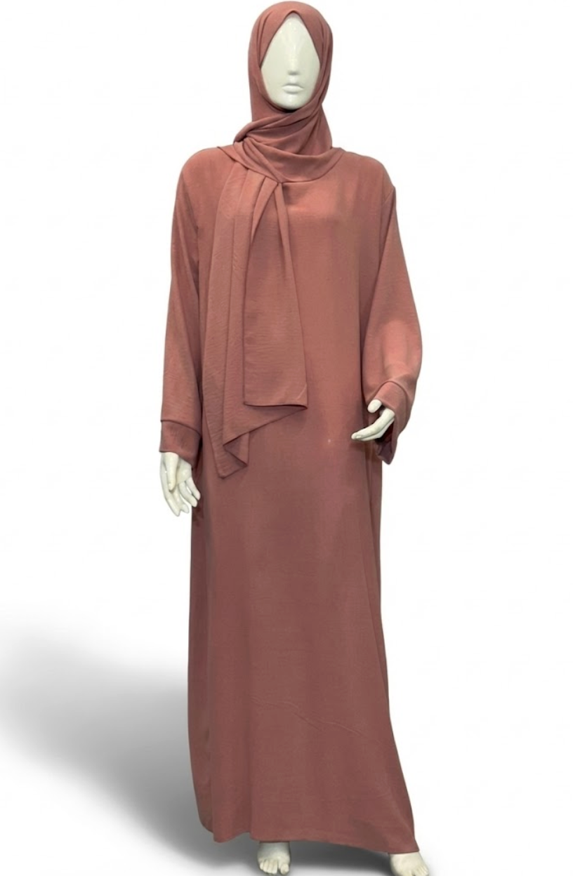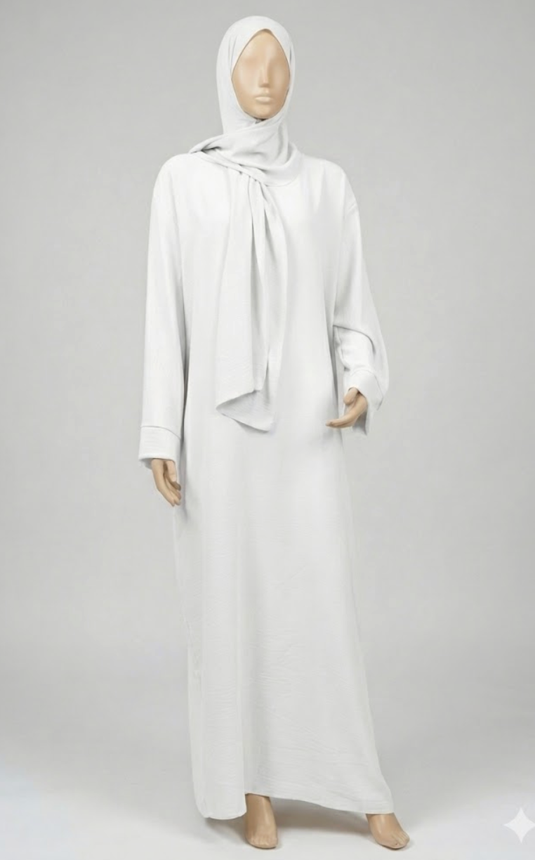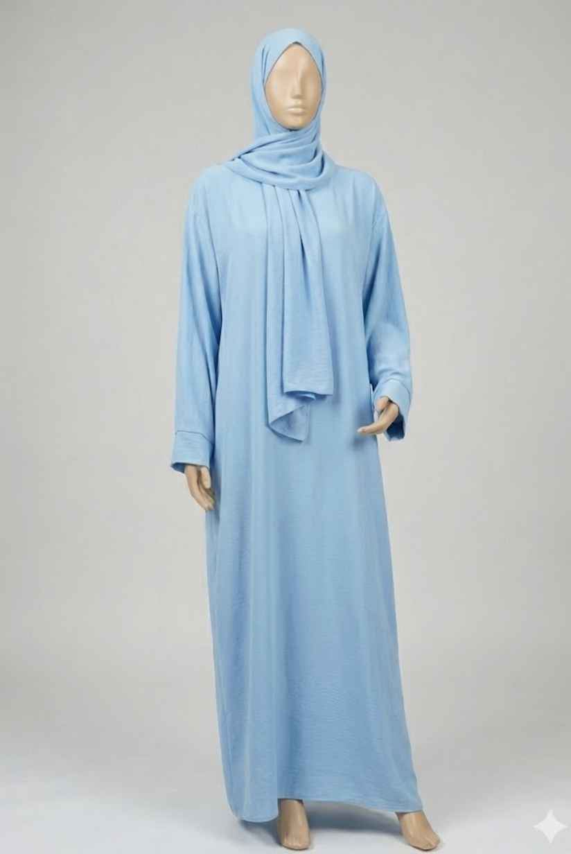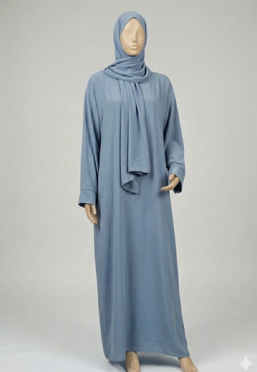 Le voile assorti intégré facilite l’enfilage et garantit une tenue harmonieuse, sans avoir besoin d’accessoire supplémentaire. Son tissu léger, doux et extensible accompagne naturellement les gestes, rendant cette robe idéale pour un usage quotidien comme pour les moments de recueillement.