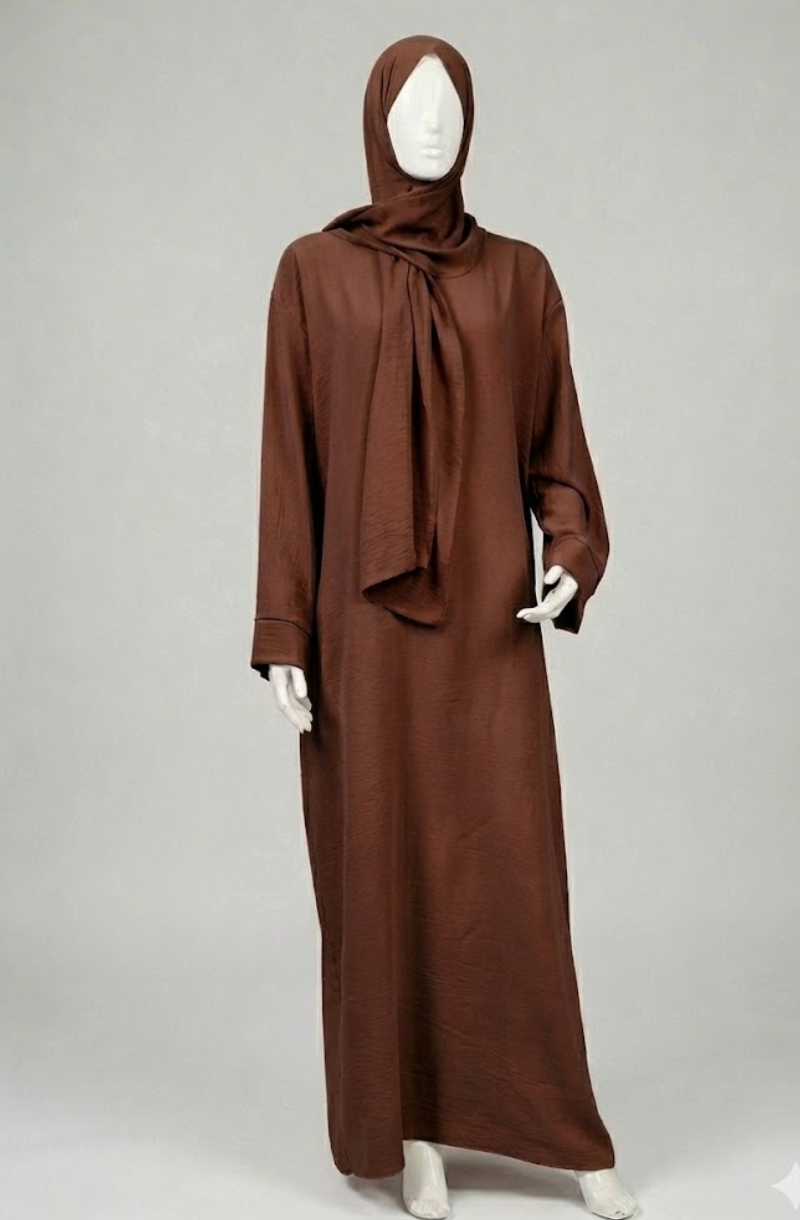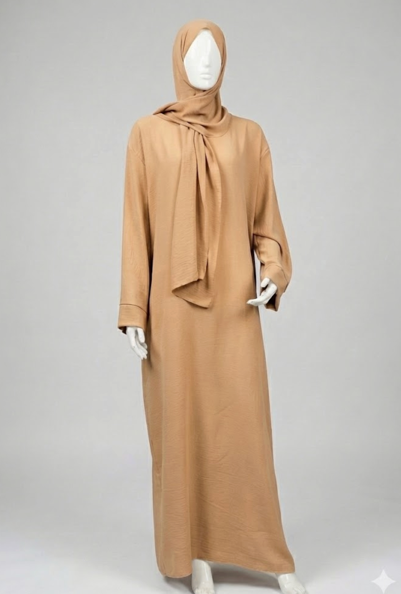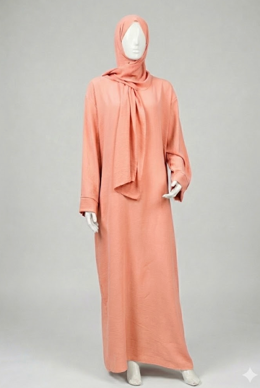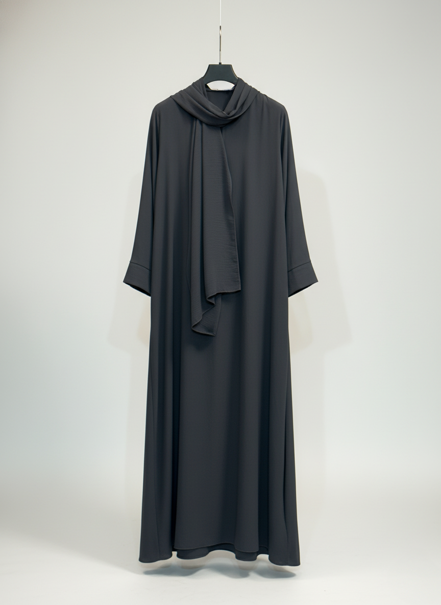 Le voile assorti intégré facilite l’enfilage et garantit une tenue harmonieuse, sans avoir besoin d’accessoire supplémentaire. Son tissu léger, doux et extensible accompagne naturellement les gestes, rendant cette robe idéale pour un usage quotidien comme pour les moments de recueillement.