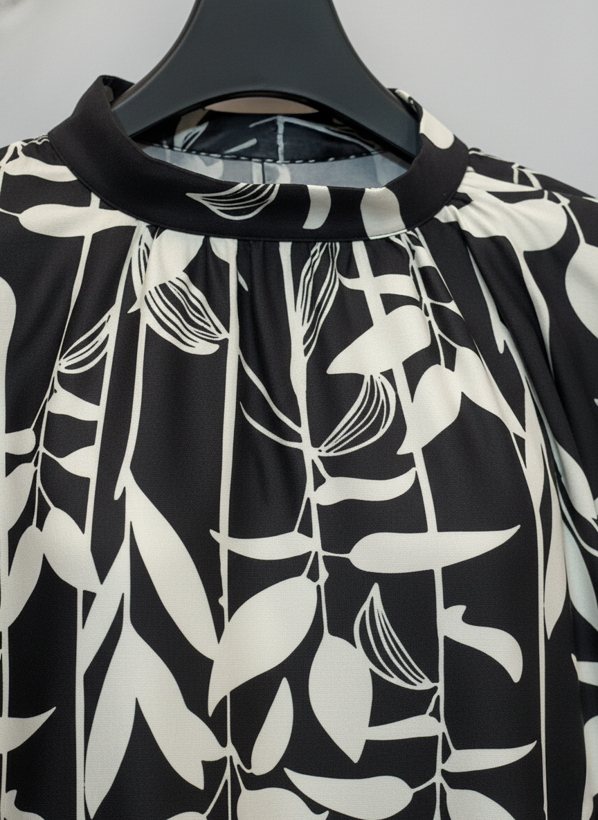 L’imprimé floral, disposé en haut près du col et en bas de la tunique, crée un bel équilibre visuel tout en laissant une zone centrale unie pour un rendu harmonieux, moderne et chic.