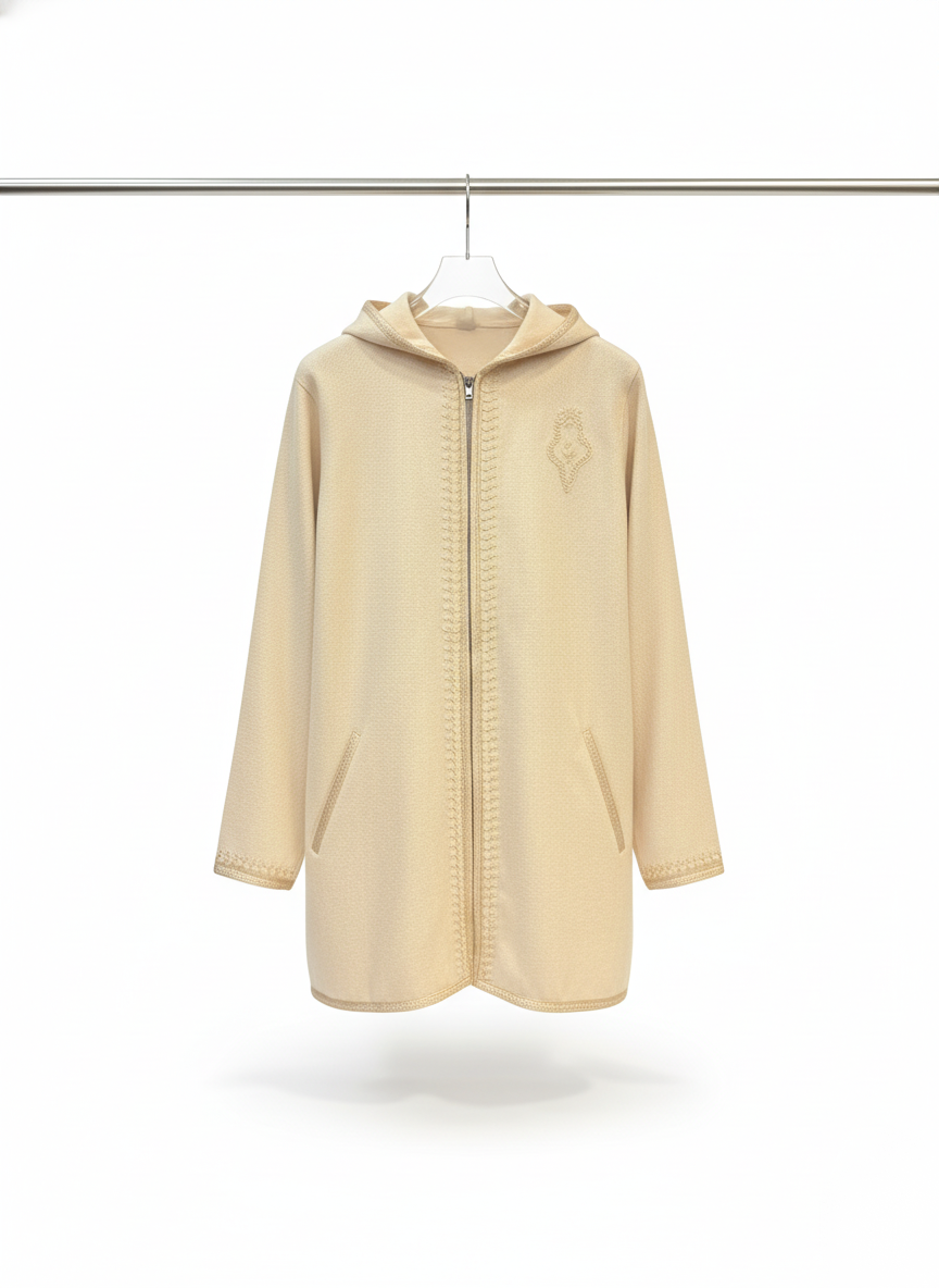Les manches et le bas du vêtement sont ornés du même détail décoratif, créant une harmonie subtile et artisanale. Sur la poitrine, un motif brodé distinctif vient renforcer son caractère authentique et raffiné, faisant de cette pièce un incontournable du vestiaire moderne inspiré des traditions marocaines.